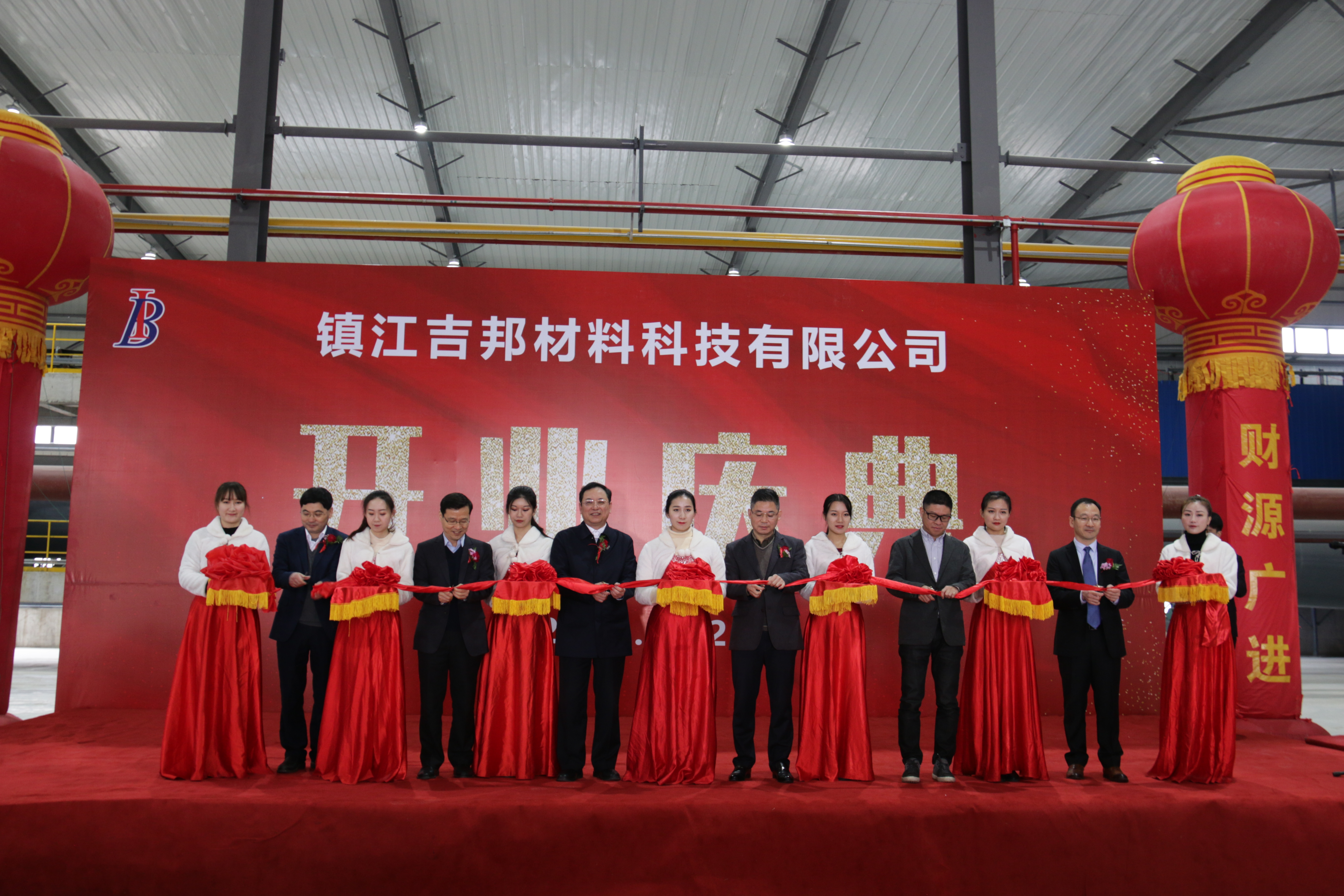 江苏苏博特新材料股份有限公司董事长缪昌文院士,中科院大连化学物理研究所张东辉院士,句容市副市长张荣海先生,融创上海区域公司王虹斌董事长王虹斌先生,江苏省建科院有限公司副院长刘加平先生以及镇江吉邦材料科技有限公司董事长张召舟博士上台共同为镇江吉邦材料科技有限公司新工厂开业剪彩。